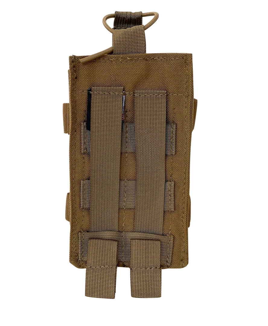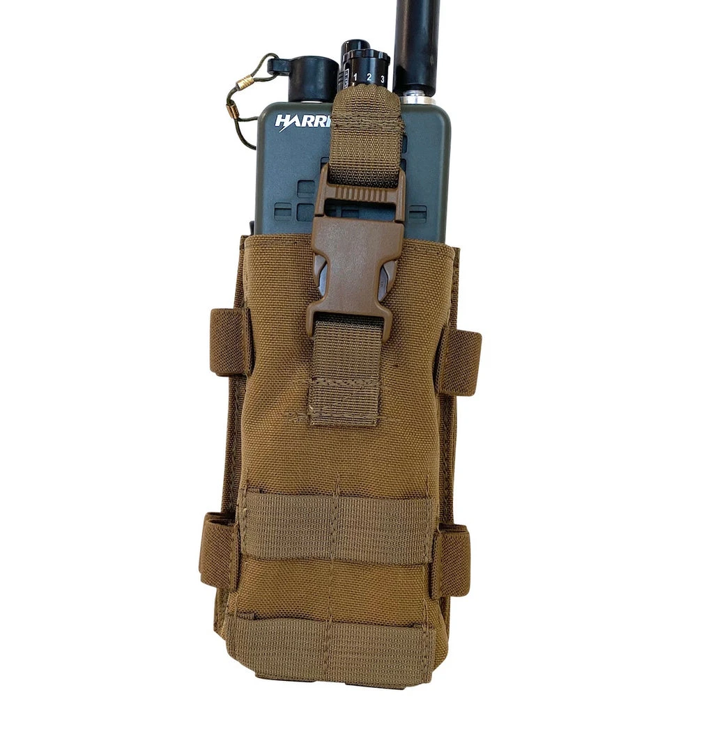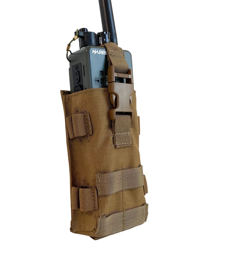The BDS Tactical Modular MBITR Radio Pouch is for the AN/PRC-152 Multiband Inter/Intra Team Radio. The radio secures in with a 1/8 adjustable bungee cord with a side squeeze buckle. On both sides of the MBITR pouch there are elastic loops for securing up to 4 chem lights or 8,12ga shot gun shells. On the front is 2 X 2 raws of PALS webbing. Made with 1000 Denier Cordura and made in the USA and is Berry Compliant. USA.Â