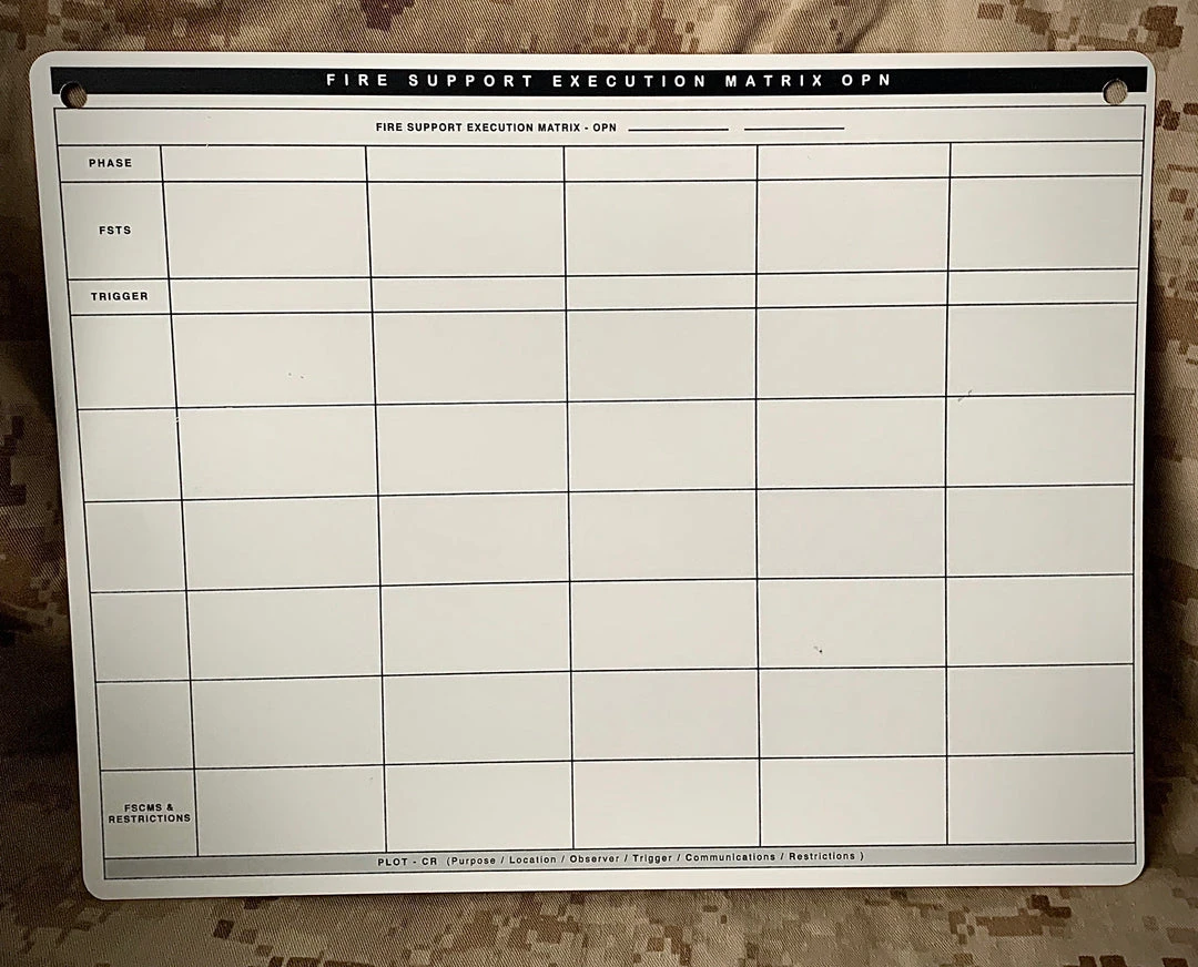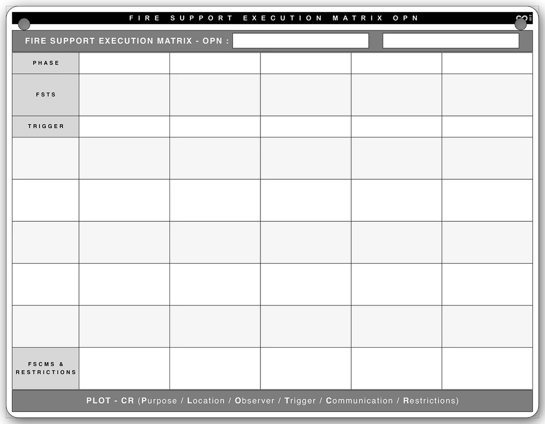 Concise planning and execution tools that shows the many factors of a fires plan.