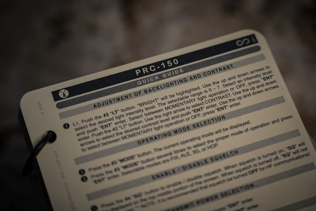 Quick guide to the basic operations of the PRC-150, Adjustment of backlight & contrast, operating mode selection squelch transmit power, Â VSWR test, battery level check, encryption, data ANDVT-BD, data PDA-184, presets, ALE programming, LQA.