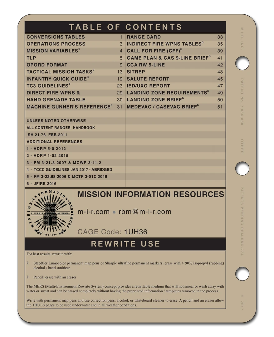 Updated Indirect Fire Weapons Tables, Direct Fire Weapons & Hand Grenade Tables, Threat Weapon Capabilities, Range Card, Recon / Ambush Sketch Template, TC3 Guidelines, Troop leading procedures, METT-TC, Machine gunners reference, Conversion tables.