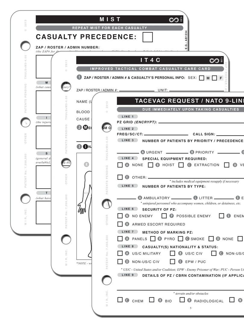 10 Pages on 5 Cards: Triage Information, IT4C (Casualty Card), TACEVAC / NATO 9-line, MIST Report, Landing Zone Brief, LZ Instructions (including LZ marking diagrams), TACEVAC Steps / Info, Terminology, IT4C Training / Use, TACEVAC Procedures, plus Care / Transport Preparations.