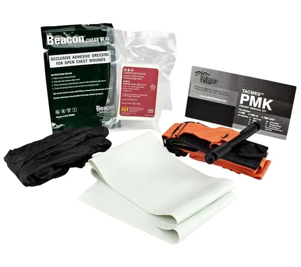 The TacMed™ Pocket Medical Kit, or PMK, provides the individual law enforcement officer or concerned citizen with the necessary medical equipment to immediately treat life threatening traumatic injuries. The SOF® Tourniquet included in the kit is rescue orange, making its application readily apparent for first responders. Also included are compressed gauze and an Esmark Bandage, which provide a wound packing and pressure dressing capability, in addition to the Beacon™ Chest Seal for treatment of any penetrating trauma.